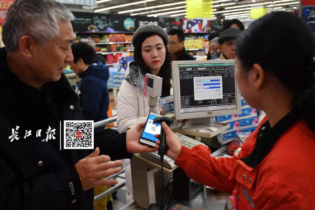 在武商量販,一位年長的顧客讓收銀員通過掃手機二維碼完成支付 長江日報資料圖
