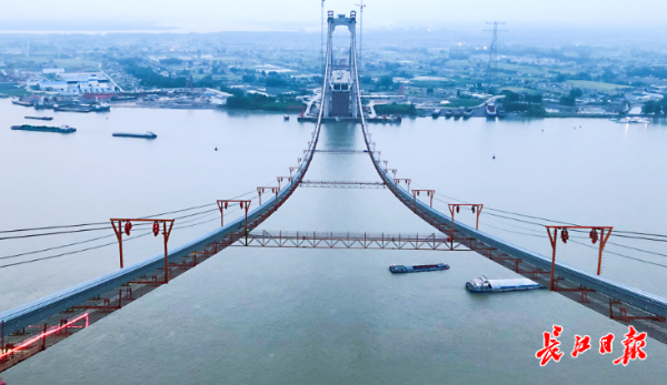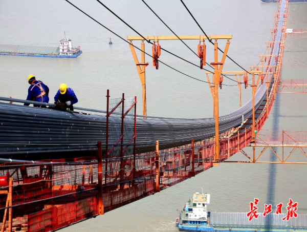 設(shè)計(jì)方中鐵大橋院副總工程師、該橋總設(shè)計(jì)師徐恭義向長(zhǎng)江日?qǐng)?bào)記者透露,從首根索股架設(shè)到完成全橋704根索股的架設(shè),工期提前28天,日均安裝索股大于9根,刷新國(guó)內(nèi)懸索橋索股安裝速度紀(jì)錄。