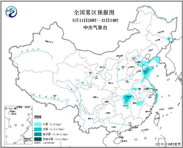中國天氣網(wǎng)訊 中央氣象臺5月11日18時發(fā)布大霧黃色預(yù)警:預(yù)計,5月11日夜間至12日早晨,渤海灣、渤海中南部海域、黃海北部海域、江浙滬沿岸海域?qū)⒂写箪F,能見度不足1公里。另外,山東半島、湖北中東部、湖南北部、江蘇南部、江西東北部等地的部分地區(qū)有大霧,山東半島局地有能見度不足200米的強濃霧。