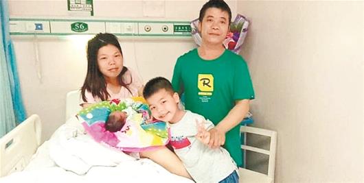 圖為:何橋妹抱著剛出生的男嬰,丈夫和大兒子在一旁細心照顧