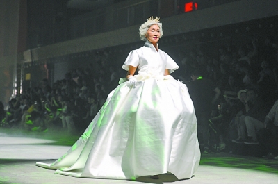 伴隨著音樂響起,100位身著白色婚紗禮服、頭發銀白的模特從帷幕下走出,領頭的是一位80歲高齡的“模特”——大秀設計師胡社光的媽媽黃玉琴。老太太穿著球鞋,拖著長長的裙擺,一步一步緩緩走來。雖然皺紋爬滿了臉龐,但她自信優雅的笑容仿佛在告訴看秀觀眾,這就是母親。