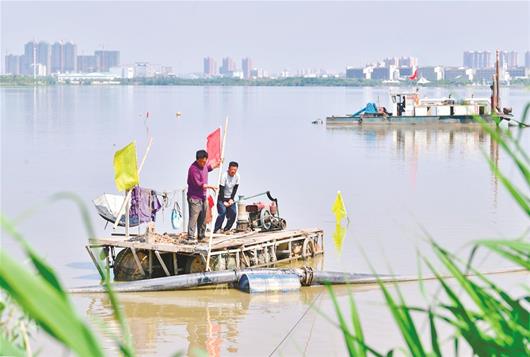 11日,記者在黃家湖岸邊看到,核心區(qū)域的清淤工程正在進(jìn)行。幾艘清淤船拖著長(zhǎng)長(zhǎng)的黑色膠皮管停在湖面上。隨著機(jī)械隆隆作響,黑色的泥漿源源不斷被抽出。
