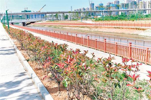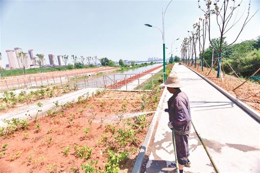 眼前的綠色植物都經(jīng)過(guò)了精心的設(shè)計(jì)。據(jù)介紹,園林景觀的規(guī)劃十分細(xì)致:水位線至坡底,種植的是狐尾藻,起到凈化水體的作用;綠道和步道之間,栽種的是云南黃馨、紫嬌花等。兩旁的行道樹(shù),全部為胸徑12厘米的香樟,樹(shù)下還滿鋪了金絲桃。