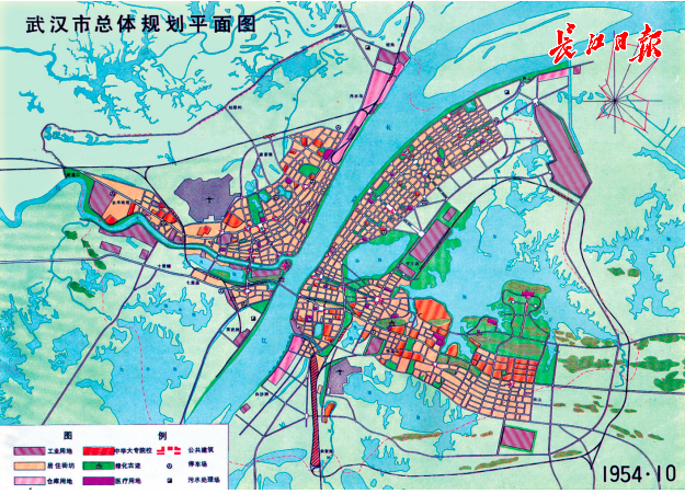 1954年版《武漢市城市總體規(guī)劃》提出 “為大型工業(yè)建設(shè)服務(wù)”,在青山、硚口等地配建大型居住區(qū),著重對工業(yè)區(qū)及鐵路樞紐等進(jìn)行了選址定點。