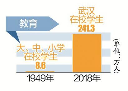 1949年武漢共有高等學校10所,中等學校67所,初等學校311所,幼兒園10所;大、中、小學在校學生8.6萬人,教師4000多人。