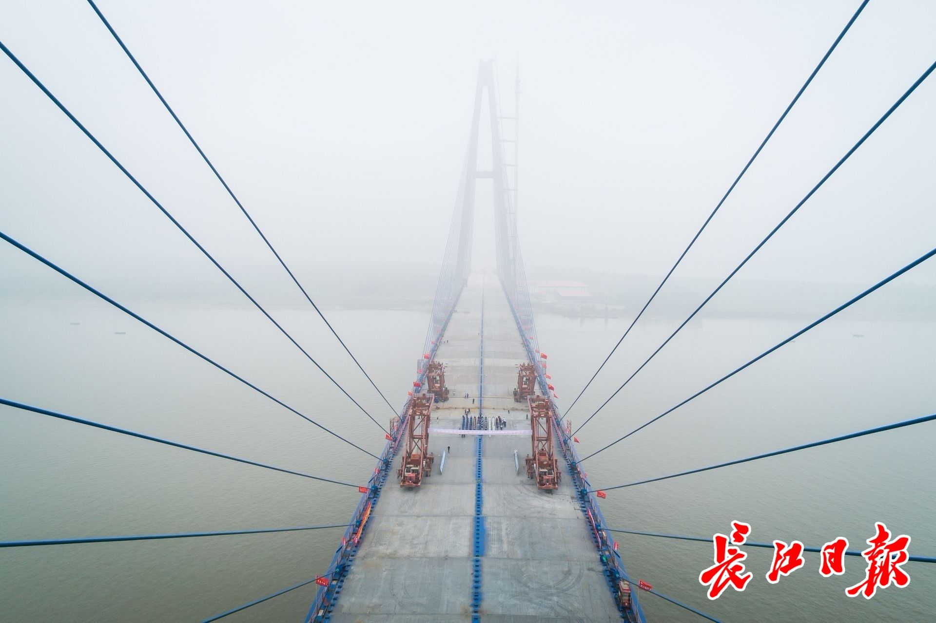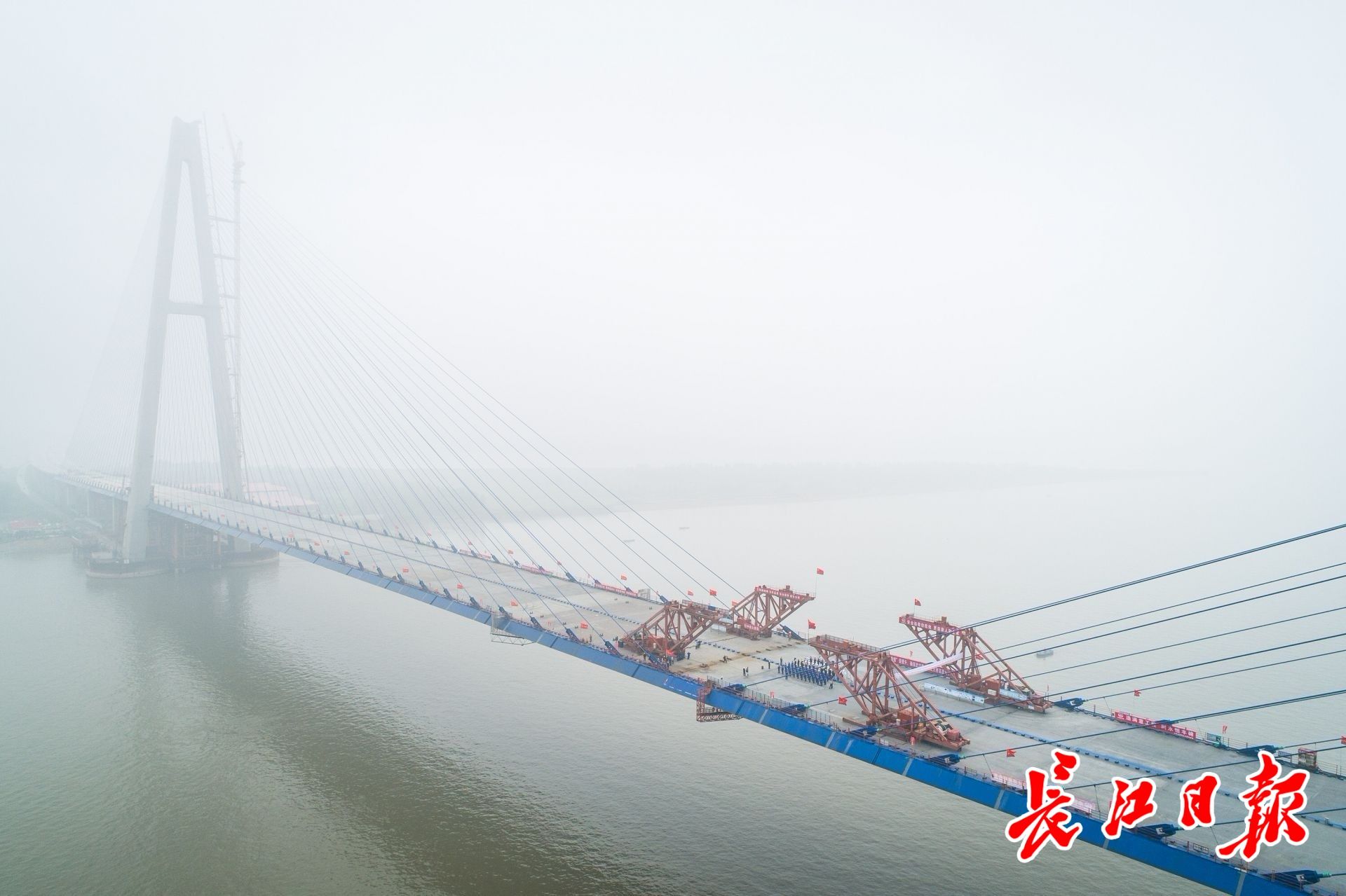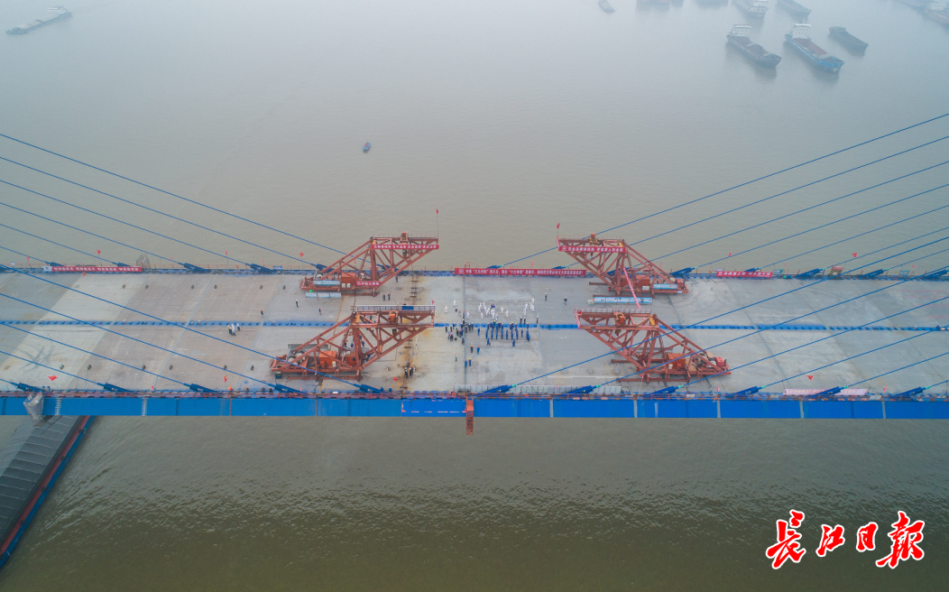 “青山長江大橋主跨的鋼箱梁采用預制吊裝架設,共有63個梁段,是目前長江上最寬的整體式鋼箱梁。”中鐵大橋局青山長江大橋項目副經理楊文明介紹,鋼箱梁單個最大重量為532噸,相當于300多輛小轎車的總重。主跨鋼梁的架設采用中鐵大橋局自主研發的全自動桅桿式架梁吊機來完成。