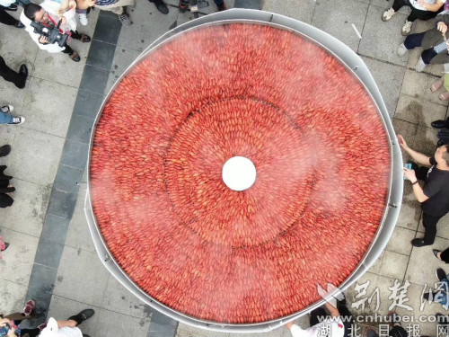活動現(xiàn)場,主辦方用一口直徑3米多的大鍋,一次性蒸制一萬余只優(yōu)質(zhì)監(jiān)利小龍蝦。經(jīng)過大世界基尼斯駐場專員的核定,監(jiān)利縣公證處公證員公證,確定監(jiān)利縣挑戰(zhàn)大世界基尼斯最大鍋清蒸小龍蝦紀錄成功。