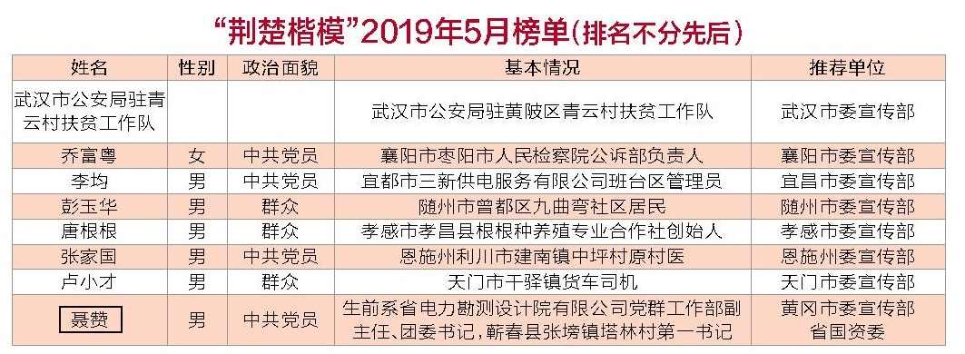 經全省各地部門層層推薦,省委宣傳部組織評審,“荊楚楷?!?019年度5月上榜人物名單揭曉,本報今日予以發布。讀者朋友也可掃“湖北宣教”二維碼,推薦您心目中的荊楚楷模。