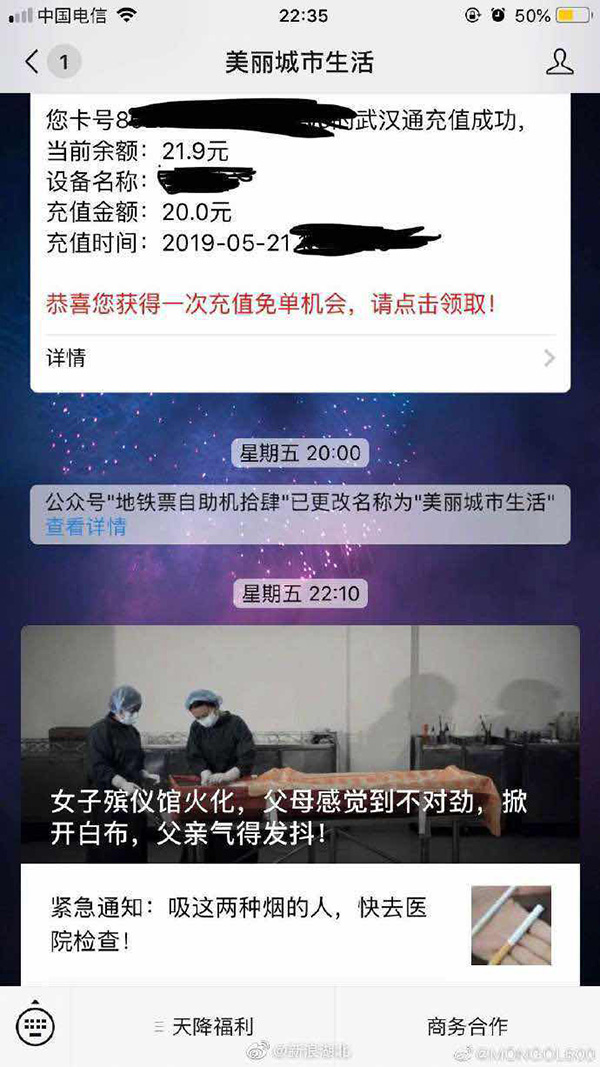 6月3日,有武漢網友發帖稱,在武漢地鐵自助充值機充值前被強制關注公眾號,賬號內容以廣告為主。4日,北青報記者獲悉,自助充值機系第三方公司管理,該公司回應稱,用戶反映的“公眾號廣告”是與第三方媒體合作的內容,目前,已與第三方媒體終止合作,沒有廣告內容。