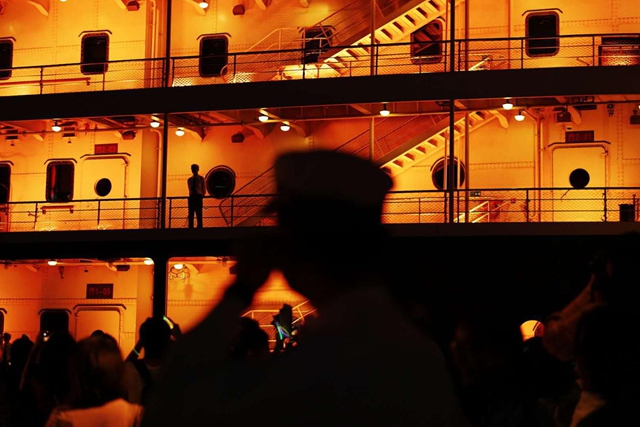 以眼前人為前景,作模糊處理,聚焦遠處站在船上的工作人員,打算呈現一種近大遠小的視覺效果
