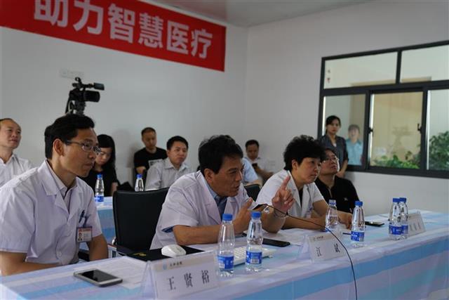 手術9時許開始,太和醫院肝膽胰診療中心主任江斌、麻醉科主任王賢裕等人通過3個視頻終端,直接觀察到神農架林區人民醫院手術臺的情況,并與主刀醫生實時交流。