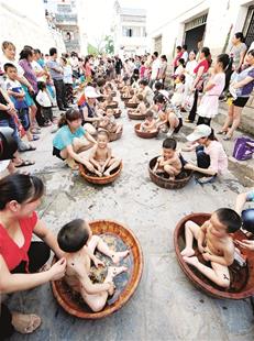 圖為娃娃們泡艾葉澡過節