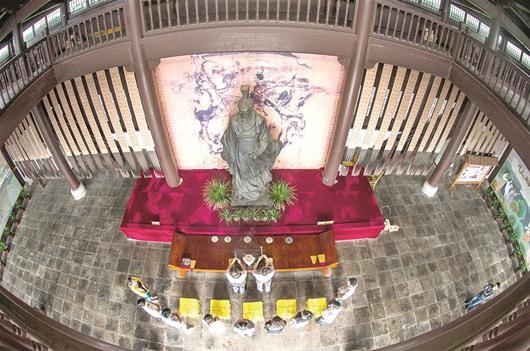 圖為屈原祠大殿內,人們參拜屈原銅像