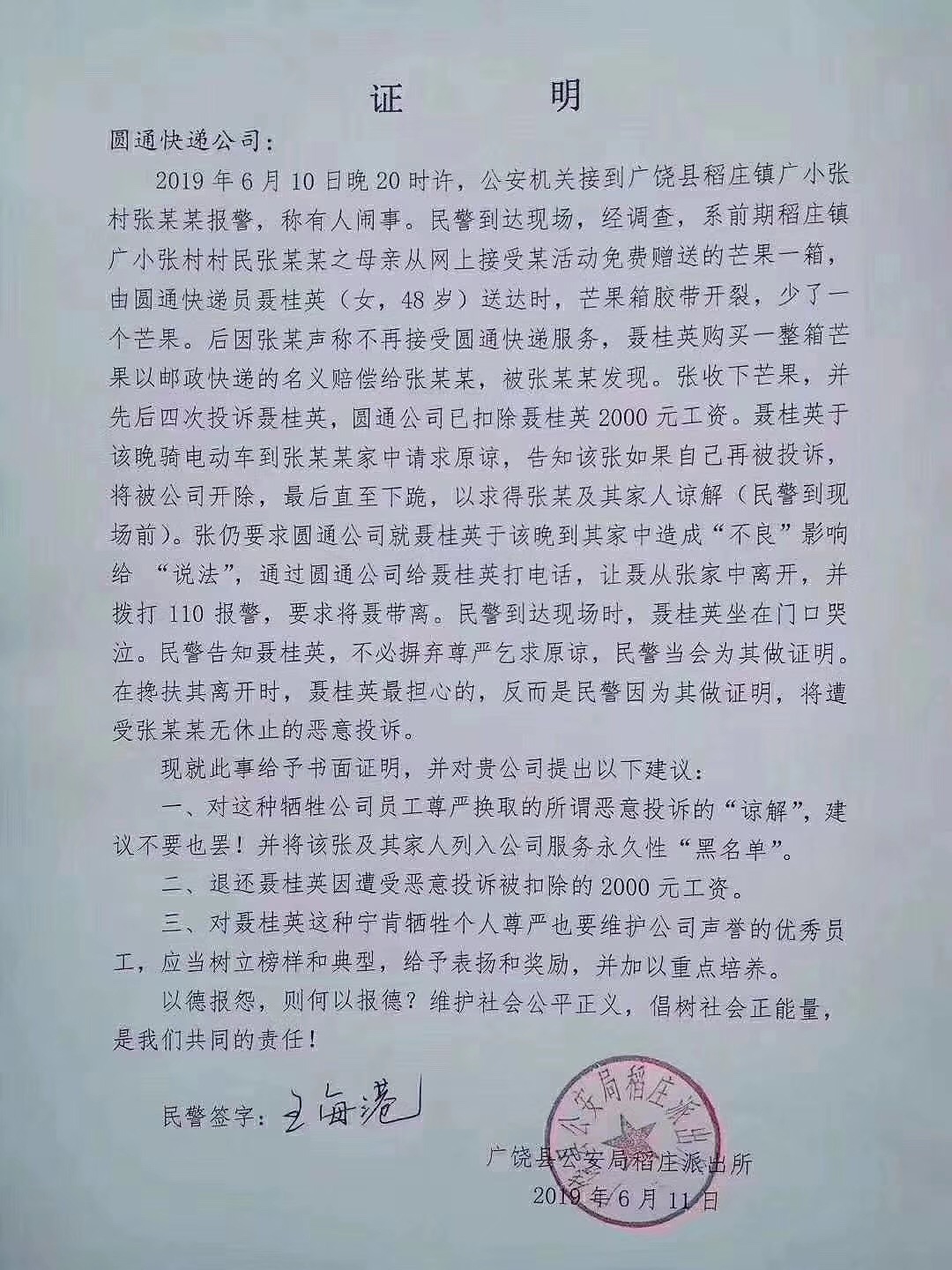 《證明》顯示,因包裝開裂少一個(gè)芒果,48歲圓通女快遞員賠償一整箱后依然遭到惡意投訴,被扣除工資2000元。快遞員為求諒解直至下跪。投訴者卻撥打110,要求民警將其帶離。