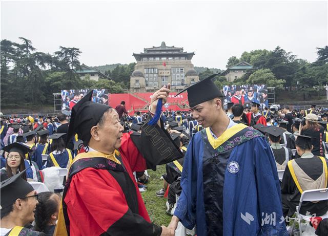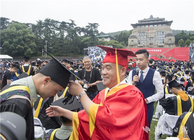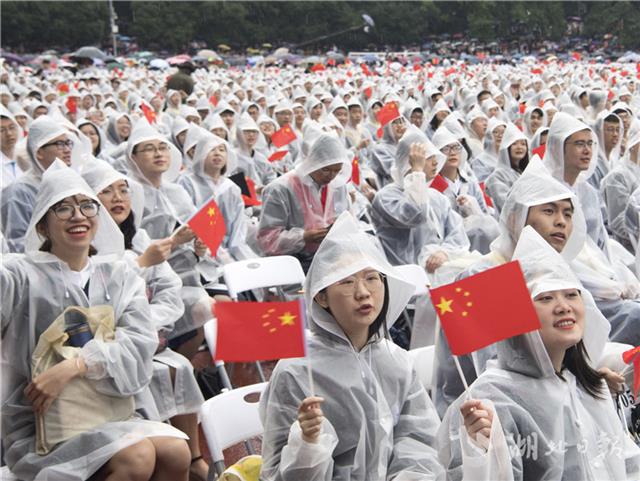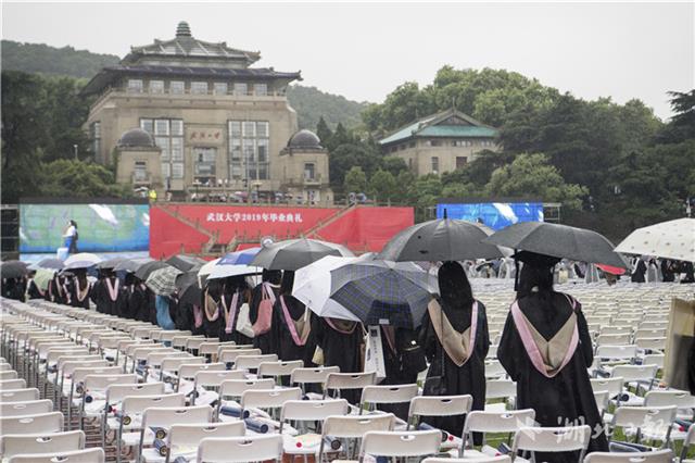 6月21日,11000多名畢業(yè)生身穿雨衣參加畢業(yè)典禮。當日,武漢大學2019年畢業(yè)典禮暨學位授予儀式在雨中舉行,81位導師為參加典禮的11000多名畢業(yè)生扶正流蘇,授予學位,為畢業(yè)生們送上美好祝福。儀式過程中,武漢暴雨傾城,萬余名師生堅持在雨中完成畢業(yè)典禮,現(xiàn)場氣氛感人。