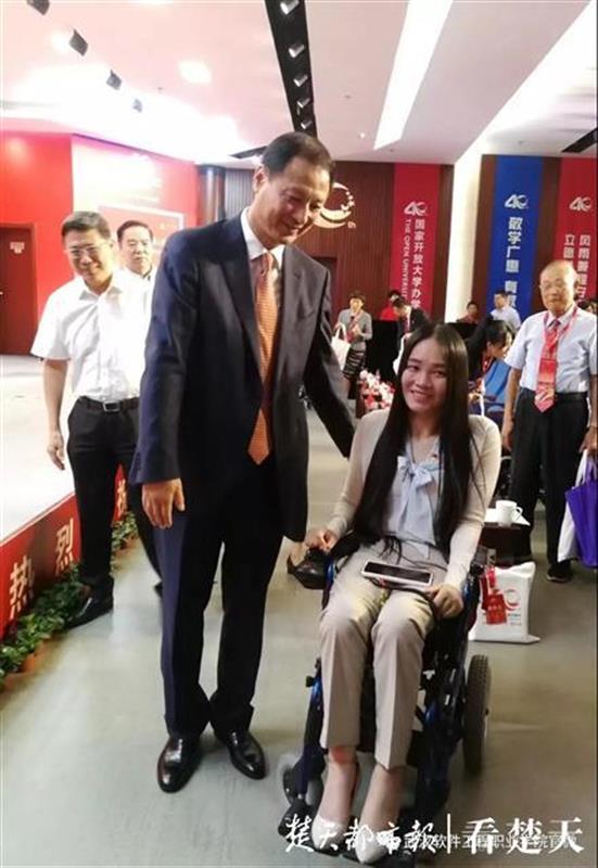 董明是武漢軟件工程職業(yè)學(xué)院(國家開放大學(xué)(武漢))教師,全國道德模范、中國青年“五四”獎(jiǎng)?wù)芦@得者、全國百名優(yōu)秀志愿者、北京奧運(yùn)會(huì)殘奧會(huì)先進(jìn)個(gè)人。她9歲時(shí)不幸高位截癱,卻沒有放棄學(xué)習(xí),在國家開放大學(xué)(武漢)師生們的關(guān)心下,她靠自學(xué)獲得大學(xué)文憑和國家心理咨詢師資格證書,并積極投身公益活動(dòng),發(fā)起成立“董明愛心志愿者團(tuán)隊(duì)”“董明愛心基金”。常年義務(wù)幫助他人的她被譽(yù)為“輪椅上的微笑天使”。6月21日上午,她也作為國家開放大學(xué)優(yōu)秀校友,在國家開放大學(xué)辦學(xué)40周年大會(huì)上發(fā)言,感恩母校給予她知識(shí)和力量,她將教書育人、立德樹人、繼續(xù)做好志愿服務(wù),為社會(huì)做貢獻(xiàn)。