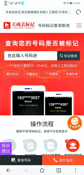 長江日報記者在網上搜索“號碼標記取消”,彈出多個“廣告”鏈接。點開一個名叫“天成去標記”的鏈接,網頁上介紹“一個號碼只需要支付一次49元”,在搜索欄內輸入吳先生的手機號碼,很快顯示吳先生的號碼被多個平臺標記為快遞外賣、鹵幫煮等,但標記平臺名并沒有顯示。