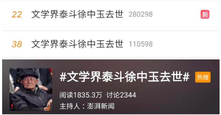 長江日報融媒體6月25日訊(記者汪偉颋)6月25日凌晨3點35分,文學界泰斗、華東師范大學終身教授徐中玉先生去世,享年105歲。上午,微博上“文學界泰斗徐中玉去世”話題一度上了熱搜,但熱度一降再降: