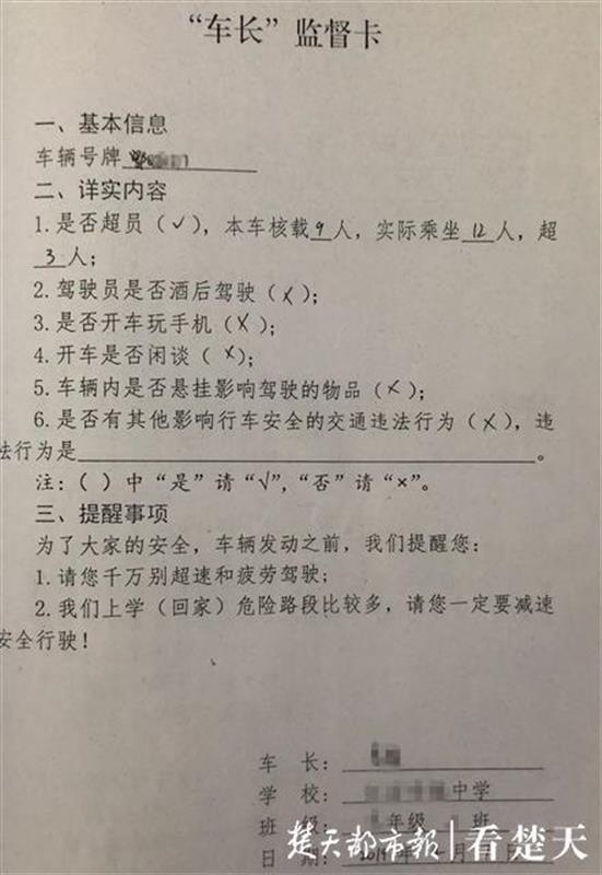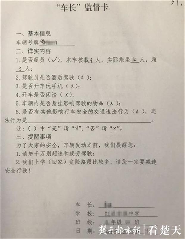 李壯是建始縣紅巖寺鎮(zhèn)某中學(xué)初中學(xué)生,同時(shí)也是當(dāng)?shù)嘏沙鏊付ǖ摹皩W(xué)生車長”,平時(shí)乘車上下學(xué)時(shí)會(huì)及時(shí)發(fā)現(xiàn)車輛是否存在違法行為和安全隱患,同時(shí)填寫“車長監(jiān)督卡”。他回憶說,今年3月中旬的一天,他乘坐一輛面包車去學(xué)校,上車后就發(fā)現(xiàn)坐滿了人,有的還是幾個(gè)人擠一排座位,明顯超員。他暗自在車內(nèi)清點(diǎn),發(fā)現(xiàn)這輛車核載9人,當(dāng)天實(shí)際載客12人,超員3人。當(dāng)天回來后,他就在監(jiān)督卡上據(jù)實(shí)填寫,并交給了老師。沒過多久,紅巖寺派出所所長張涵在查閱“學(xué)生車長監(jiān)督卡”時(shí),發(fā)現(xiàn)了李壯提供的這個(gè)線索,隨后,民警對學(xué)生反映的鄂Q8×××7牌面包車司機(jī)劉某進(jìn)行了約談,提醒他嚴(yán)格依法駕駛。