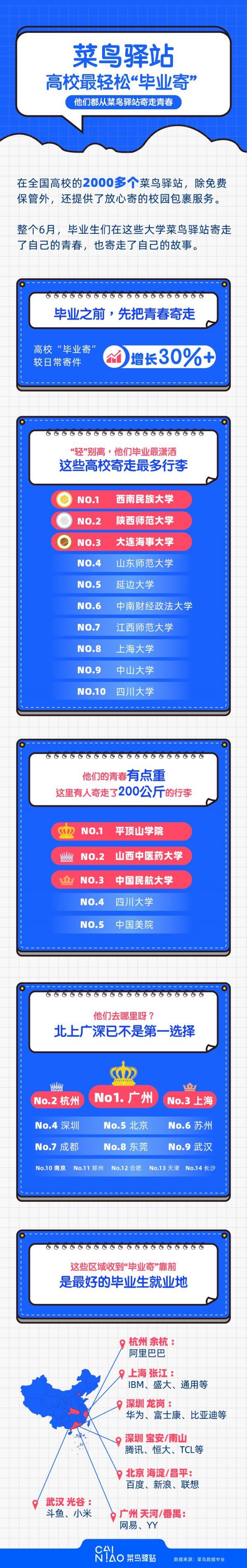 武漢晨報訊(記者張珺)隨著7月初畢業季結束,高校畢業生紛紛離開大學,奔赴新的人生戰場。新生上學“空手到”,離?!爱厴I寄”,已成為大學生新的生活方式。對畢業生來說,“畢業寄”的去向很多是自己人生的下一站。菜鳥驛站數據顯示,北上廣深已不是唯一選擇,武漢光谷成為最好的畢業生就業地之一。