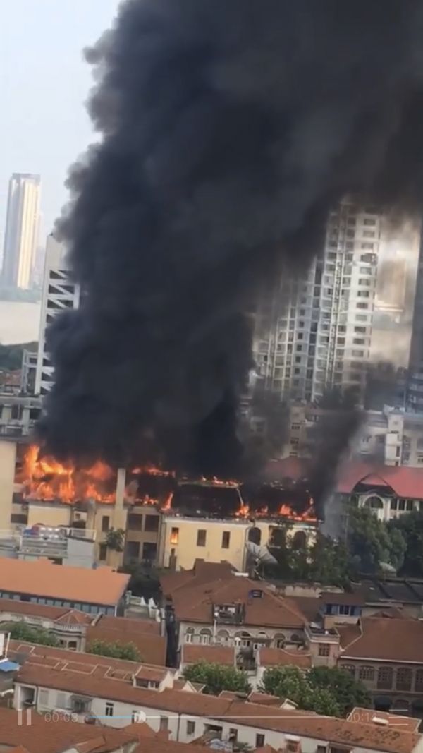 在現場視頻中,江漢飯店頂樓起火,冒出黑煙,遠處可見明火。遠在車站路的目擊者稱,事發時現場能夠聽到嘭嘭聲響,隨后聽到有物體掉落在地的聲音。