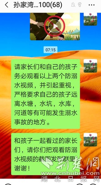 孫家灣小學(xué)在家長群發(fā)布防溺水安全通知截圖。安全辦供圖