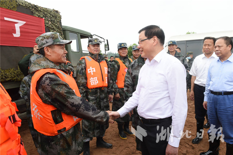 受近期強降雨影響,考田河全線水位達歷史峰值,近日黃梅縣濯港鎮(zhèn)蔡垸村段發(fā)生潰口,空降兵某旅、陸軍某舟橋旅、武警湖北省總隊及民兵預備役人員聞令而動,火速搶險救災,目前潰口已順利封堵合攏。堤壩上紅旗飄揚,戰(zhàn)士們站成人墻,正接力加固堤防。應勇踏著泥濘,看望慰問奮戰(zhàn)在一線的解放軍指戰(zhàn)員、武警部隊官兵和民兵預備役人員代表。他說,無論是抗擊疫情還是防汛救災,人民子弟兵始終沖鋒在前,于危急時刻為人民群眾筑起安全長城,你們是新時代最可愛的人!省委省政府和湖北人民感謝你們。他還叮囑地方負責同志,務必做好戰(zhàn)士們的后勤服務保障,確保大家健康安全。