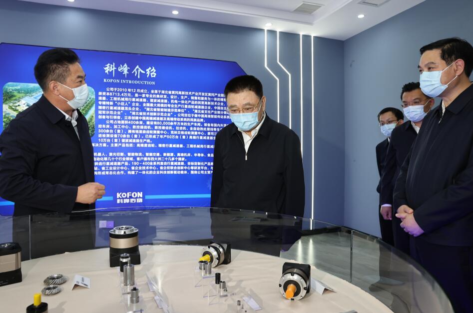 隨后,王蒙徽來到湖北科峰智能傳動股份有限公司,察看高精度減速器等產品和智能制造生產線,了解企業科技創新、產品研發、市場銷售等情況,勉勵企業繼續加強技術攻關,進一步提升企業核心競爭力。在聽取黃岡工業經濟、重大項目建設情況介紹后,王蒙徽強調,要堅持穩字當頭、穩中求進,聚焦主導產業,著力延鏈補鏈強鏈,全力穩住經濟基本盤。要堅持創新驅動發展,發揮企業創新主體作用,加強“卡脖子”技術攻關,加快產業轉型升級和新舊動能轉換,努力建設全國重要的先進制造業基地。要更好統籌疫情防控和經濟社會發展,加大助企紓困解難力度,為企業營造良好發展環境。