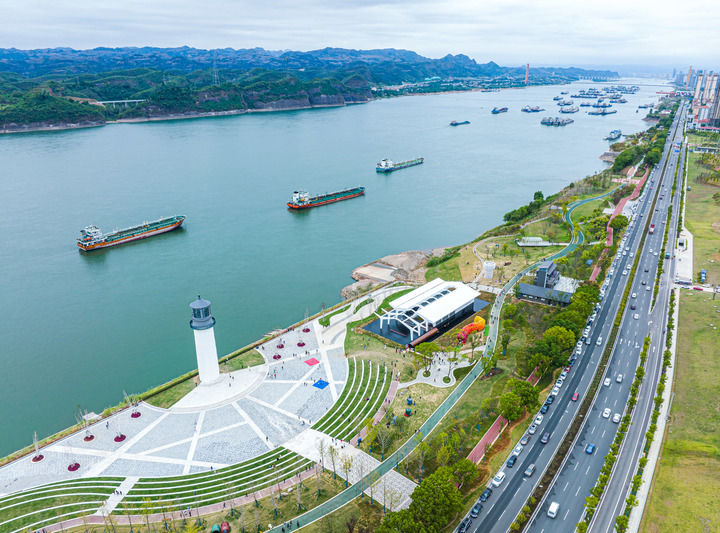 2022年10月5日,市民在湖北省宜昌市濱江公園燈塔廣場游玩(無人機照片)。該廣場是在實施岸線復綠等綜合措施后,由老舊碼頭改造而成。新華社記者 肖藝九 攝