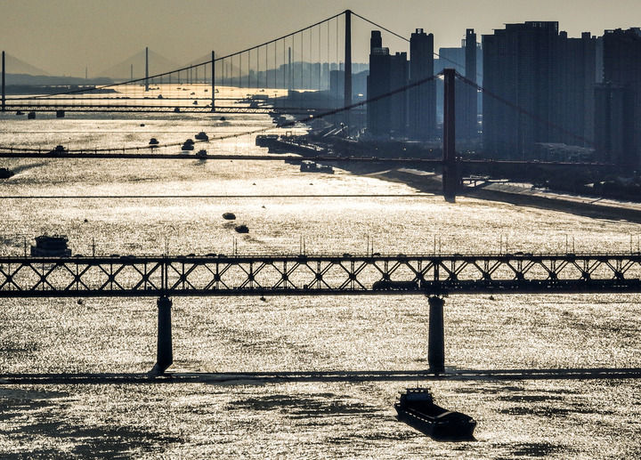 2024年1月23日,一列火車從武漢長江大橋上駛過(無人機照片)。新華社記者肖藝九攝