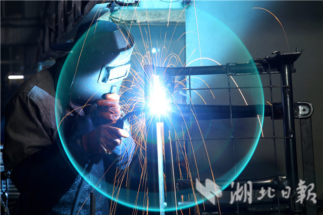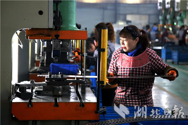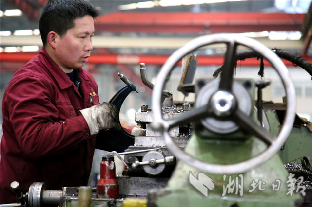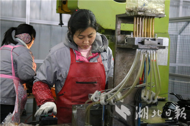 2月14日,在湖北省十堰市鄖陽(yáng)經(jīng)濟(jì)開(kāi)發(fā)區(qū)偉士通汽車(chē)零件有限公司,工人在產(chǎn)品生產(chǎn)線上作業(yè)。