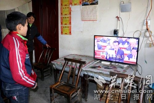 共青團湖北省委一行在走訪該校四年級留守兒童李振宇時,李振宇和爺爺奶奶一起,正在用電視收看中央電視臺重播的全國兩會實況,領導們對留守兒童能夠從小關心國家大事,收看新聞的做法表示贊賞。