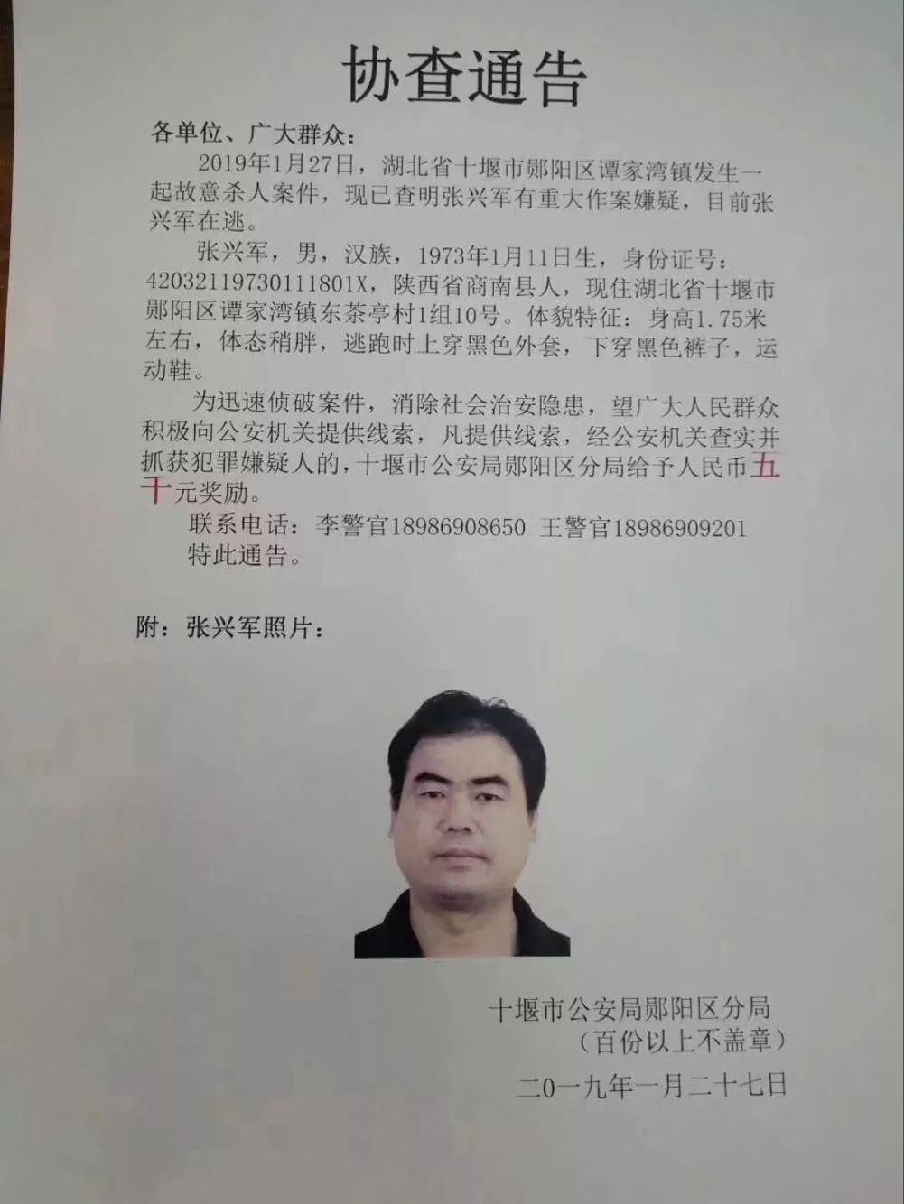 2019年1月27日,湖北省十堰市鄖陽區譚家灣鎮發生一起故意殺人案件,現已查明張興軍有重大作案嫌疑,目前張興軍在逃。