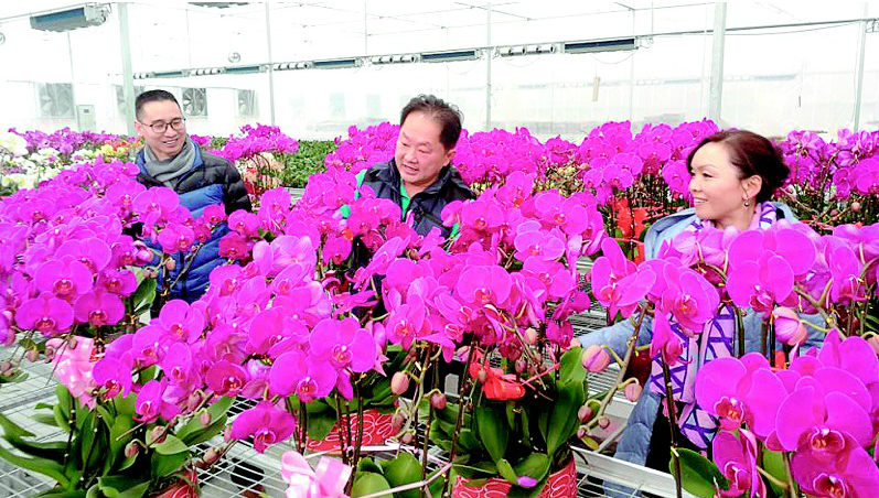 棚內溫暖如春,許佳瑞正接待選花的客人。他介紹,這些蝴蝶蘭又叫大辣椒,象征新的一年紅紅火火,是春節送禮饋贈的佳品。一些蝴蝶蘭系著蝴蝶結,還寫有新年祝福語,每盆售價480元。