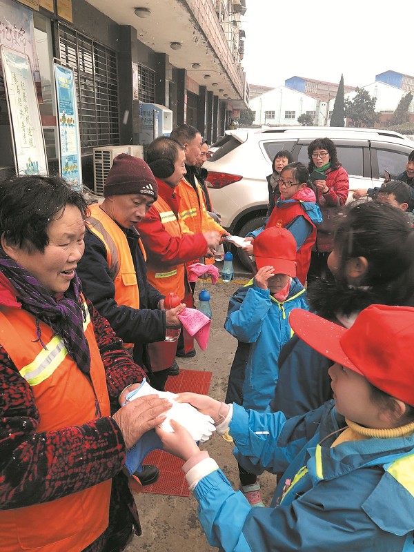2月18日上午,張灣區車城路街辦艷湖社區的小學生志愿者們,將自己積攢的各種廢品賣掉后積攢的錢為轄區環衛工人買來手套和水杯,表達對環衛工人的謝意。同時,小學生志愿者們還向市民發出倡議:“少扔一個垃圾,共同為我市創建全國文明城市作貢獻?!?/p>