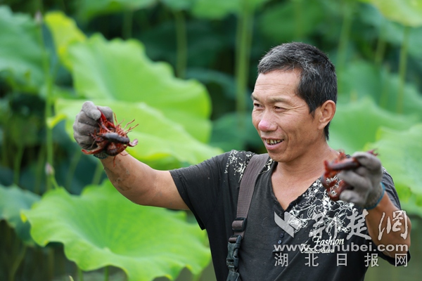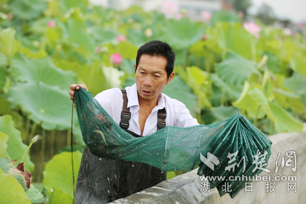 荊楚網客戶端—荊楚網消息 (通訊員 朱本雙) 8月6日,張力正在采摘蓮蓬,用地籠套捕小龍蝦。