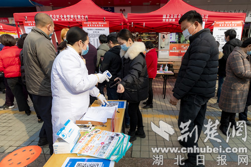 招聘現(xiàn)場人頭攢動,活動入口處設(shè)立體溫檢測點和實名登記臺,專業(yè)醫(yī)護人員貼心的為企業(yè)工作人員和求職工作者提供免費的口罩和酒精,實行分批分時段,掃碼測溫進場。