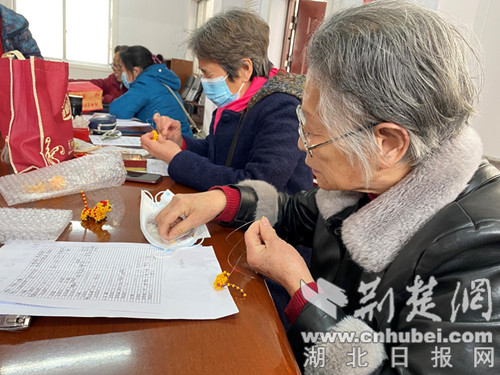 “這里的珠子用黃色,下一排的珠子才用黑色……”2月23日下午,紅衛街道王灣社區永光新村小區鄰里中心里,一群人均年齡超過60歲的阿姨正圍坐在一起,用五顏六色的小珠子制作各類手工藝品。