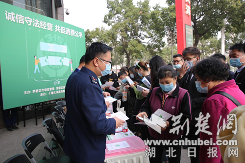 荊楚網(湖北日報網)訊(通訊員 沙正秋、徐璠麗)3月15日,茅箭區為貫徹落實省、市2022年“3·15國際消費者權益日”紀念活動要求,宣傳2022年消費維權“誠信守法經營、共促消費公平”主題,茅箭區市場監管局開展“3.15國際消費者權益日”系列活動。