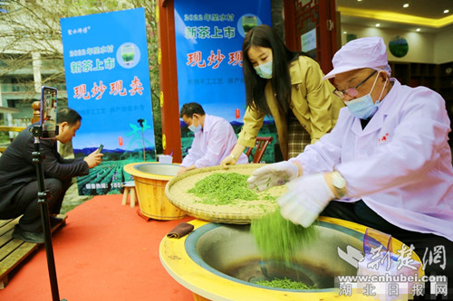 荊楚網(湖北日報網)訊(通訊員張華魁、魏文勇)“我們馬上開始殺青,這是鮮葉加工的第一道工序。”3月29日下午4時許,竹山縣上庸茶城商業街傳來陣陣茶香,一家名為圣水村茶莊的店鋪用直播現場手工炒茶的方式開業。