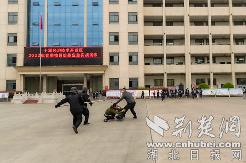 荊楚網(wǎng)(湖北日報(bào)網(wǎng))訊(通訊員 劉愛理、王魁、萬紓)4月15日是第七個(gè)全民國家安全教育日。當(dāng)天上午,十堰經(jīng)開區(qū)2022年春季校園防暴應(yīng)急實(shí)戰(zhàn)演練在十堰市第五中學(xué)舉行,本次演練結(jié)合國內(nèi)突發(fā)校園安全事件真實(shí)案例,聚焦社會(huì)關(guān)切,突出實(shí)戰(zhàn)實(shí)操,共設(shè)置社會(huì)青年持械入侵校園和師生發(fā)生沖突等兩個(gè)場景組織演練。市公安局內(nèi)保支隊(duì)、反恐支隊(duì),經(jīng)開區(qū)公安分局、文教衛(wèi)局等相關(guān)部門負(fù)責(zé)人到場指導(dǎo),全區(qū)各中小學(xué)和幼兒園相關(guān)負(fù)責(zé)人現(xiàn)場觀摩演練。