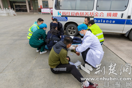 上午9點(diǎn),演練正式開始。第一場演練,模擬一位學(xué)生家長找老師有事,校園內(nèi)保人員發(fā)現(xiàn)身上攜帶兇器,上前阻止,該學(xué)生家長持刀沖入校園,并砍傷正在操場上體育課的學(xué)生和老師,護(hù)校隊(duì)成員持器械第一時(shí)間與歹徒搏斗,接到報(bào)警的公安、醫(yī)院人員分別趕到現(xiàn)場,公安干警與護(hù)校隊(duì)協(xié)同制服歹徒,救護(hù)車及時(shí)接走受傷學(xué)生和老師返回醫(yī)院救治。