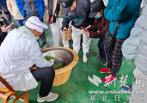 采茶結(jié)束后,游客們把采摘的鮮葉拿到茶山下的弘和茶業(yè)加工車間,在制茶師傅的指導下親自動手炒茶,體驗炒茶樂趣,現(xiàn)場十分熱鬧。