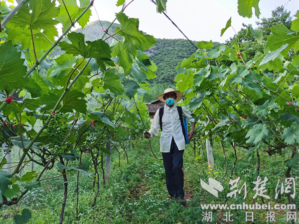 荊楚網(湖北日報網)訊(通訊員 蘇優培)6月21日,鄖西縣三官洞林區三官洞村,果農們搶抓農時加緊開展葡萄田間管護,為葡萄增產增收打好基礎。