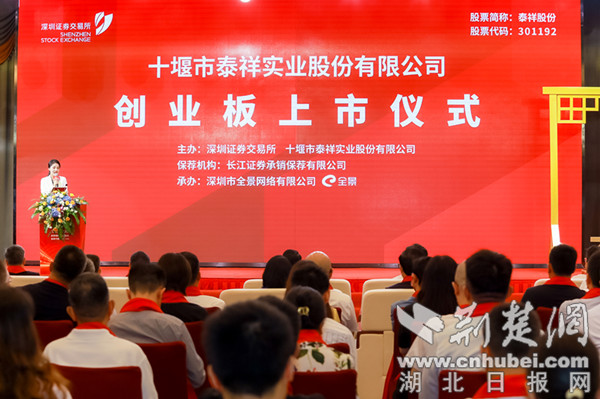 荊楚網(湖北日報網)訊(通訊員 劉愛理)8月11日上午9點30分,伴隨著十聲洪亮的鐘聲,十堰市泰祥實業股份有限公司(簡稱泰祥股份)在深圳證券交易所創業板成功上市。企業股票代碼為301192,開盤即突破37元,開盤即實現上漲92.26%。
