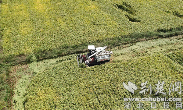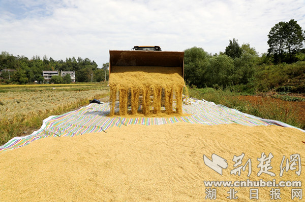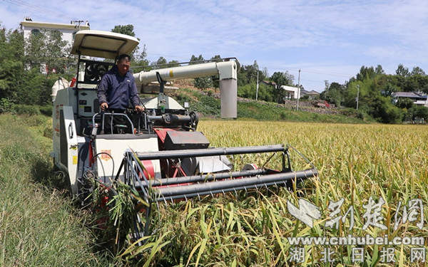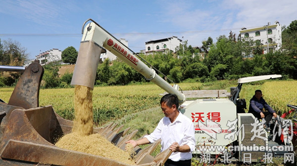荊楚網(湖北日報網)訊(通訊員 向繼華 袁帥)“轟隆隆……”9月6日,在湖北竹山縣寶豐鎮喻家塔村種糧大戶黃偉的水稻基地里,伴隨著陣陣轟鳴聲,收割機在金黃色的稻田里來回穿梭,一串串飽滿的稻穗被收割機“吞”進去,秸稈粉碎后從收割機尾部排出,一粒粒金黃的稻谷盡入“囊中”,陣陣稻草香也在空氣中彌漫開來。