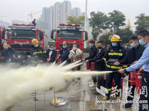 活動人員在消防員的指導下體驗滅火器正確使用方法。通訊員 供圖