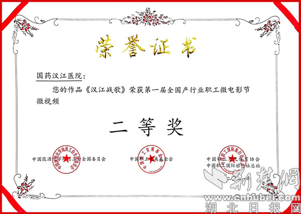 荊楚網(湖北日報網)訊(通訊員 楚志平)2月17日,第一屆全國產行業職工微電影節在北京亦莊召開,國藥漢江醫院的微視頻《漢江戰歌》從近千部作品中脫穎而出,榮獲微視頻二等獎,榮耀時刻國藥漢江醫院黨總支副書記、副院長、工會主席舒常紅現場領獎。國藥醫療黨委書記、董事長楊軍及黨群工作部部長劉洋出席微電影節。