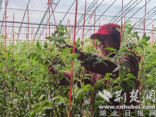 “西紅柿生長勢強,莖桿的每個節位上都會分生腋芽,而每個腋芽都能萌發成枝,開花結果。如果任其生長,就會消耗掉大量養分,造成落花落果,果形變小,產量和品質下降。”鄖西縣綠豐智慧農業科技有限公司夯土式日光溫室大棚內,香口鄉農業技術蘇華兵正在指導工人及早摸叉。