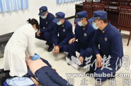 醫務人員向消防員詳細講解心肺復蘇。通訊員 供圖